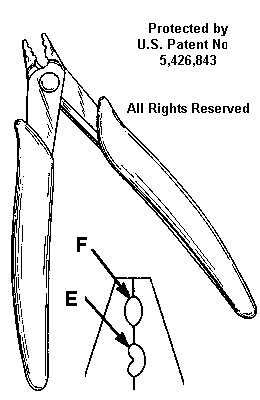 If you examine the closed jaws of the Bead Crimping Pliers you will see two distinct openings, a kidney shaped one (E) and an oval one (F). The process of forming the crimp requires two steps - a crimping operation and a final rounding operation. These are carried out at two forming regions - the initial crimping station (E) and the final rounding station (F). Detailed instructions along with other tips and notes may be found using the following links: