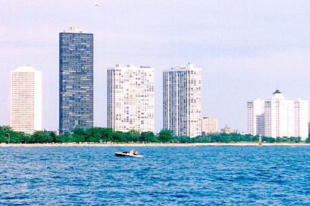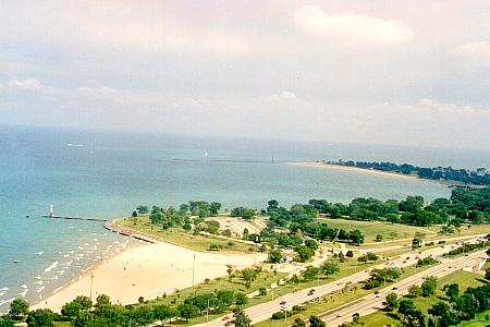 Looking South East from 35 floors up. It is summer (life guards are on the beach) and the wind is light and cooling from the North East. It is a perfect day to walk along the lake shore perhaps all the way to downtown Chicago which is about 13 kilometers away.