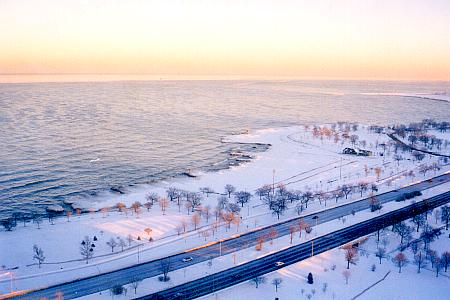 Winter in late afternoon. The divided highway is Lake Shore Drive which hugs the shore of Lake Michigan for over 25 kilometers passing through parks, harbors, museums, beaches and even a free public zoo. This beautiful park system was the vision of Daniel Hudson Burnham (1846-1912) who, along with other leaders, established the Burnham commission. The commission met after the great Chicago fire and proclaimed that the entire lake front (save for a bit along the Chicgo river) would be devoted only for public use.
